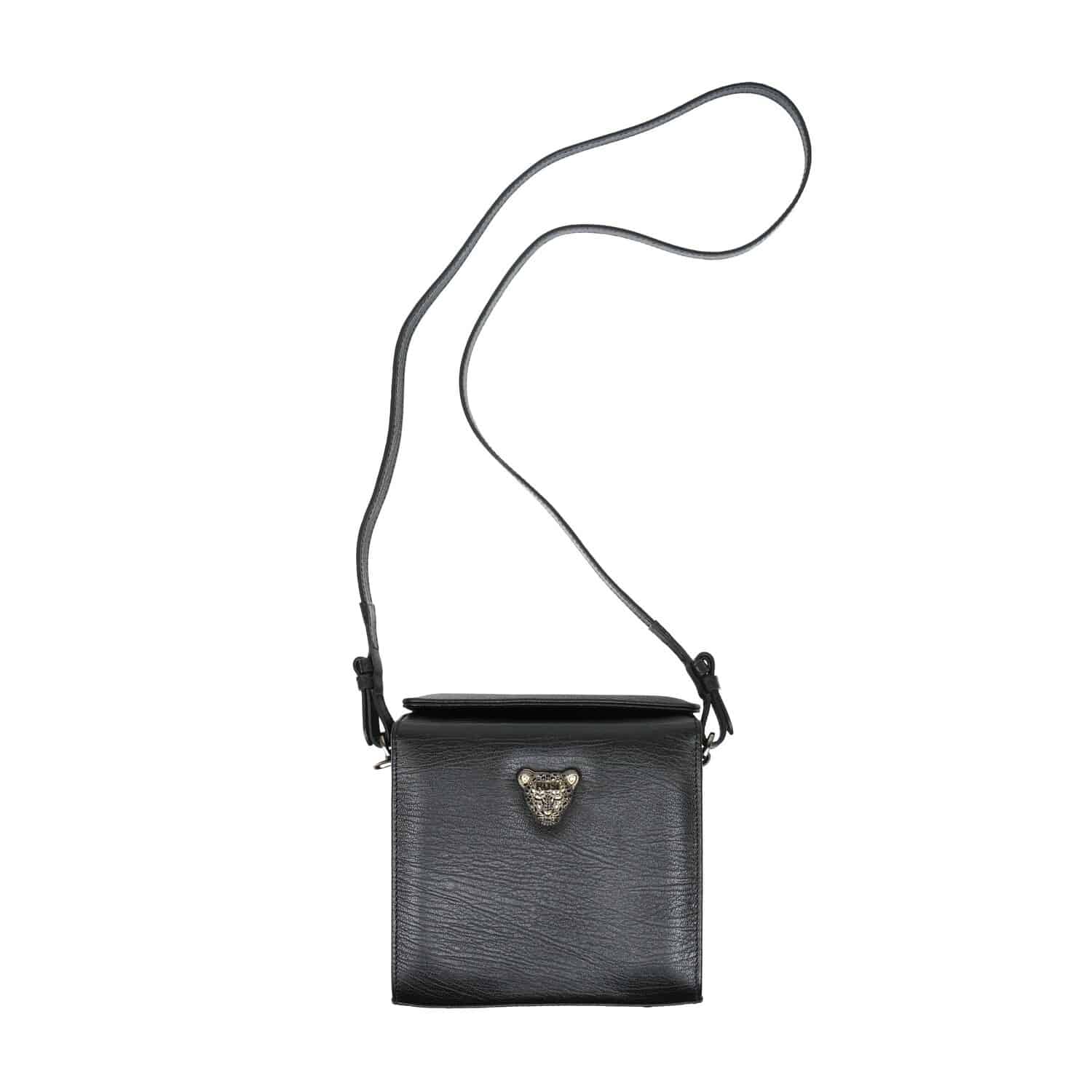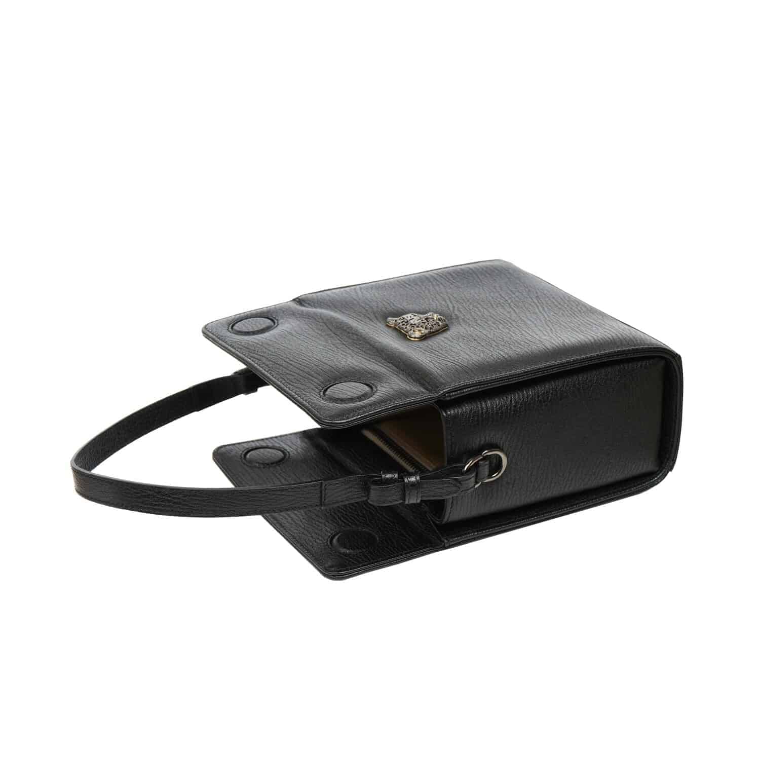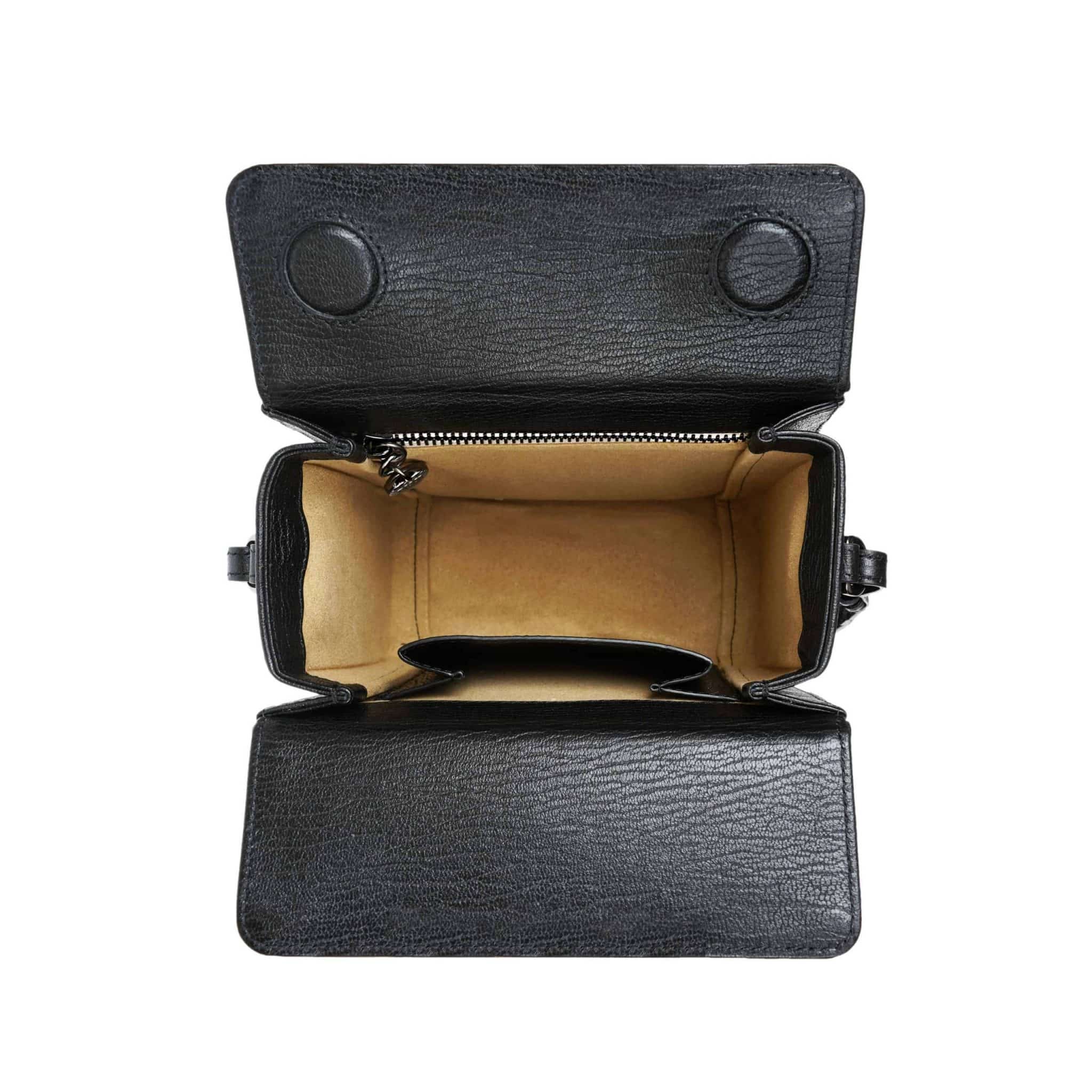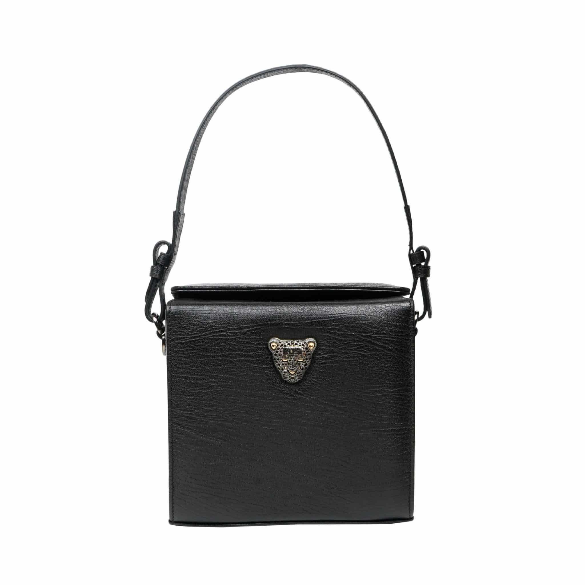 RusiDesigns Signature Boxy bag called MicroB. This Black leather Boxy bag comes with 2 interchangeable straps. Unique minimalistic magnet closure.