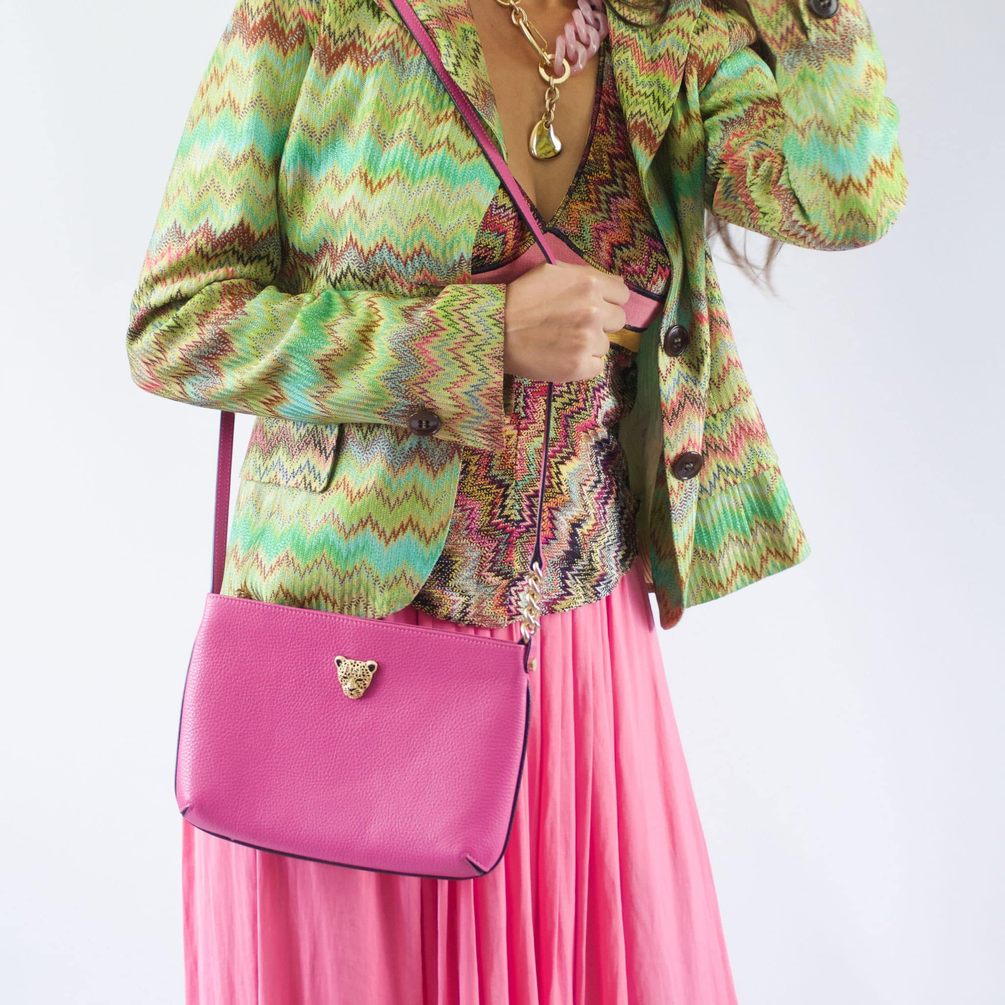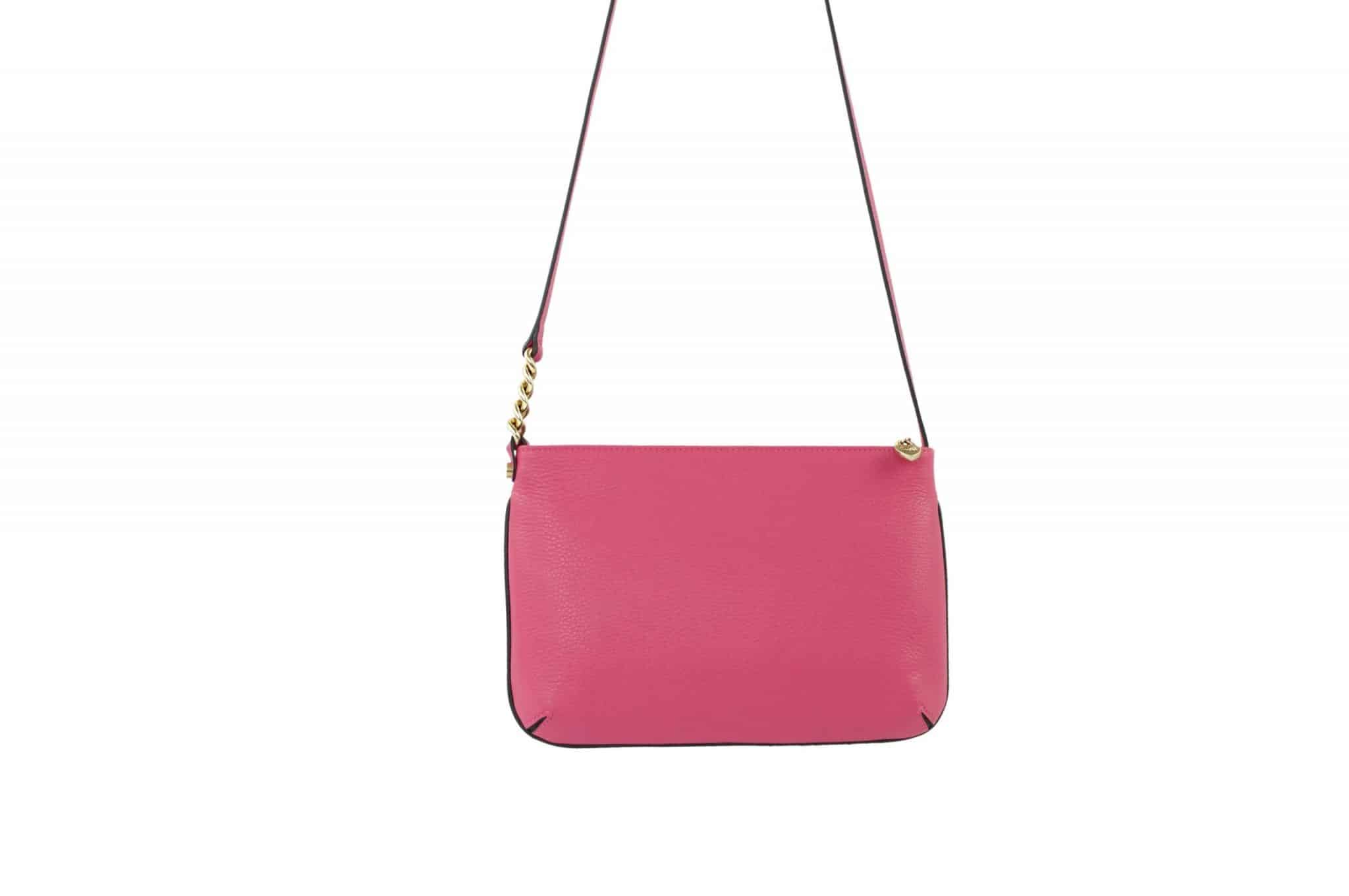 Italian made, British design. RusiDesigns pink leather crossbody bag with signature RUSI gold logo and leather strap with gold chain detailing. Featuring invisible zip closure at the top.