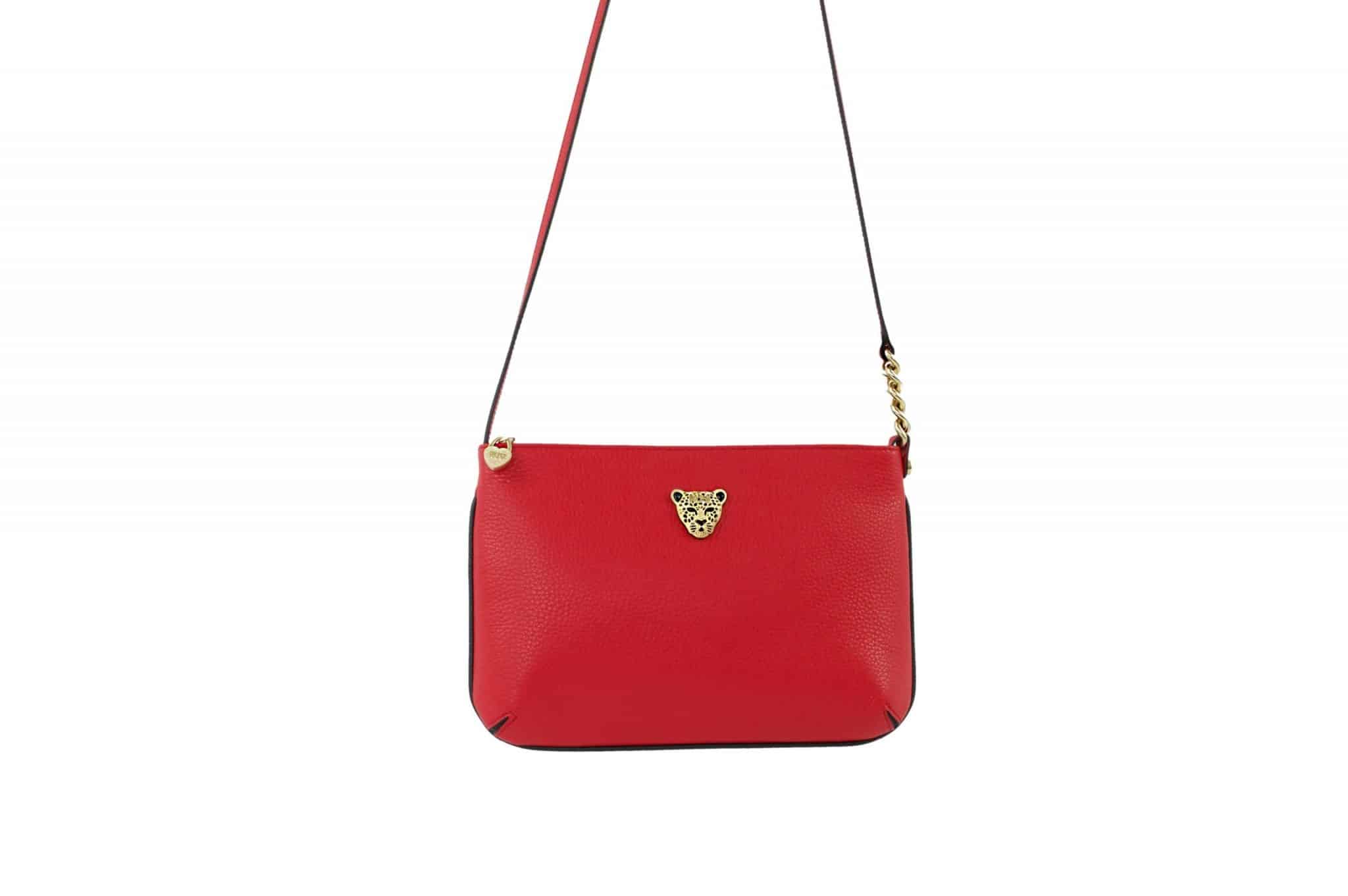 Italian made, British design. RusiDesigns red leather crossbody bag with signature RUSI gold logo and leather strap with gold chain detailing. Featuring invisible zip closure at the top.