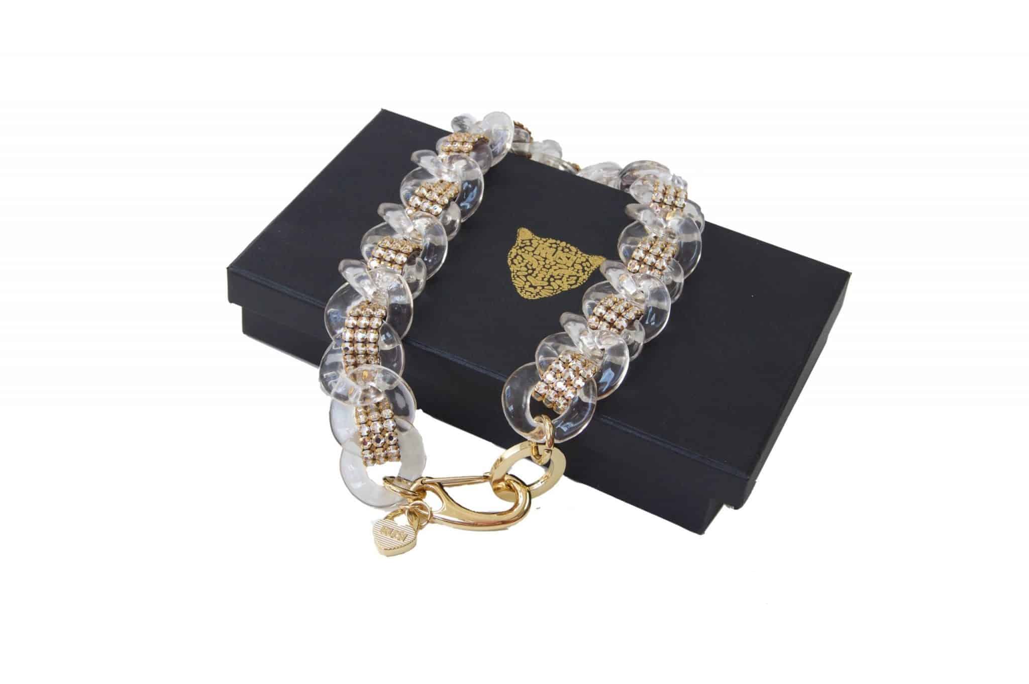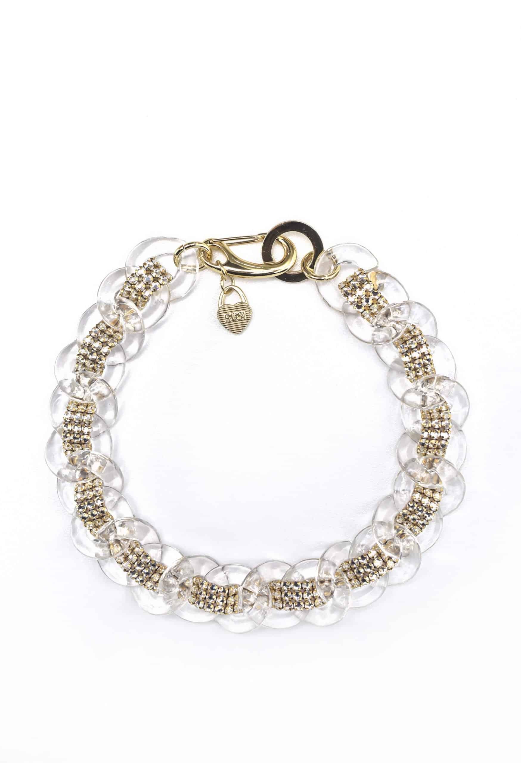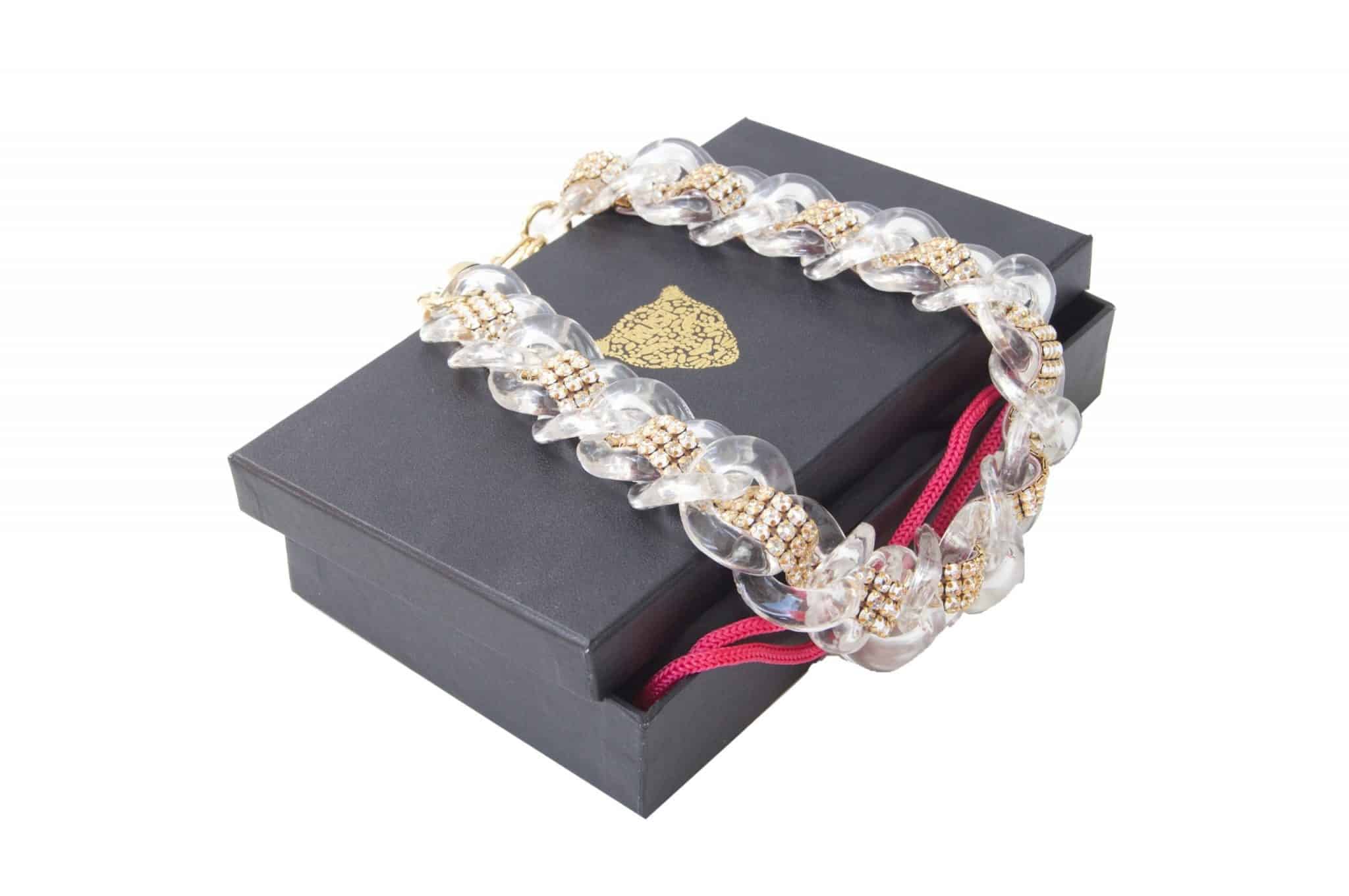 Clear plexi chain with white Crystals.  Lined in soft velvet ribbon.